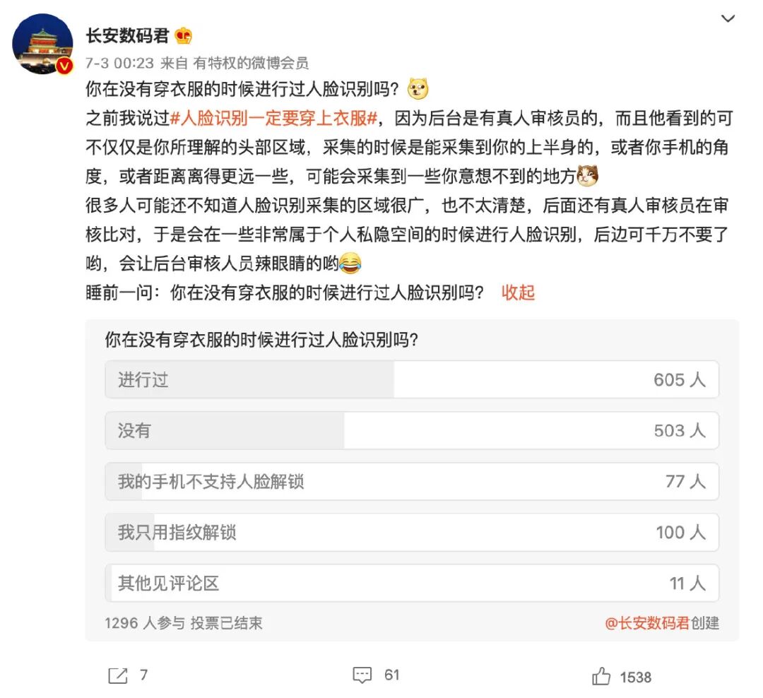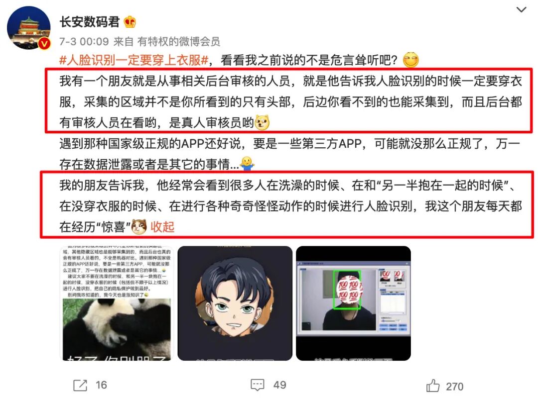 据长安数码君爆料,从事后台审核的朋友告诉他:他朋友在经常会看到很多人在洗澡的时候、在和“另一半抱在一起的时候”、在没穿衣服的时候、在进行各种奇奇怪怪动作的时候进行人脸识别,我这个朋友每天都在经历“惊喜”。