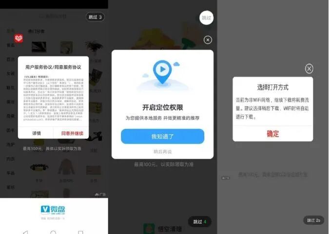 一开屏,就看到很明显的诱导按钮,什么「同意并继续」,「我知道了」和「确定」这样的按钮,跟上面的三张图一样。