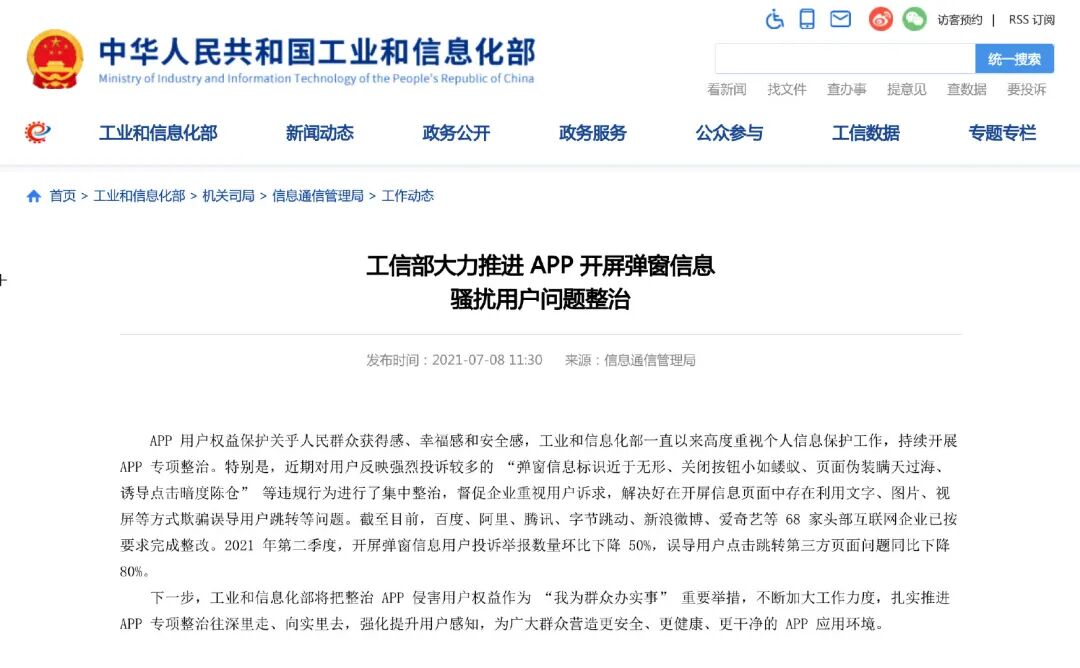 7 月 8 日,工信部大力推进 APP 开屏弹窗信息骚扰用户问题整治的活动。