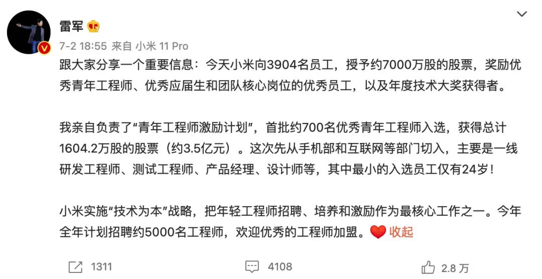 先是通过青年工程师激励计划,向 700 名优秀青年工程师赠与了 3.5 亿的股票,紧接着又向 3904 名员工授予了 7000 万股的股票。