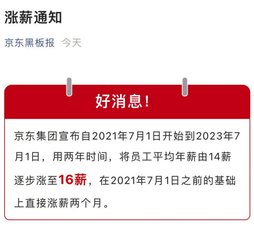 昨天,京东集团宣布自 2021 年 7 月 1 日开始到 2023 年 7 月 1 日,用两年时间,将员工平均年薪由 14 薪逐步涨至 16 薪,在 2021 年 7 月 1 日之前的基础上直接涨薪两个月。