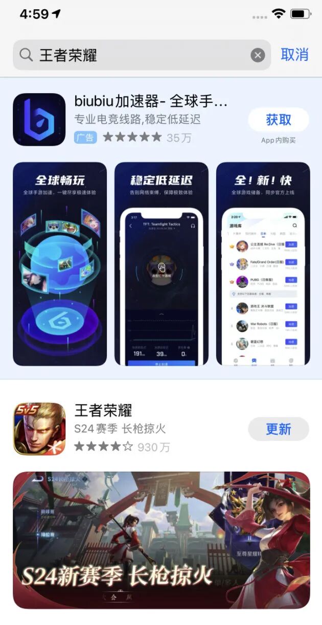 比如:你在苹果应用商店,搜一下「王者荣耀」,出现在第一位的是广告,而不是王者荣耀游戏软件。