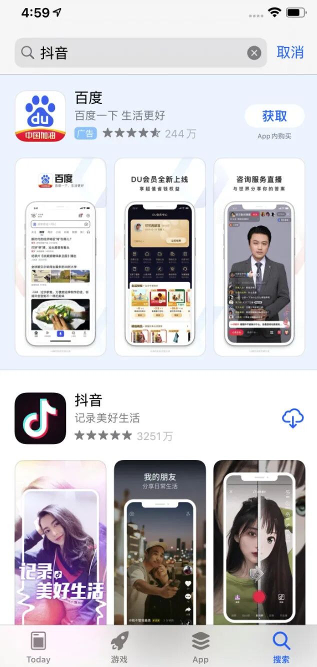 再比如:我们搜一下抖音,出现在第一位的是「百度」App,而不是抖音软件。