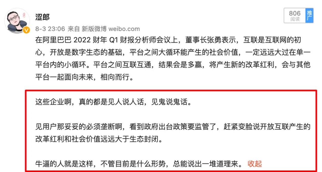 但是,最近逍遥子在阿里巴巴 2022 财年 Q1 财报分析师会议上的讲话,其实可以证明这条消息大概率是真的。