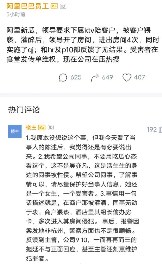 阿里巴巴认证员工匿名称:领导要求下属 ktv 陪客户,被客户猥亵,灌醉后,领导开了房间,进出房间 4 次,同时实施了 qj;和 hr 及 p10 都反馈了无结果,受害者在食堂发传单。