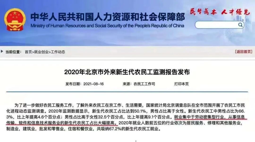 报告上说:就业集中于劳动密集型行业,从事信息传输、软件和信息技术服务业的新生代农民工占比大幅提高。