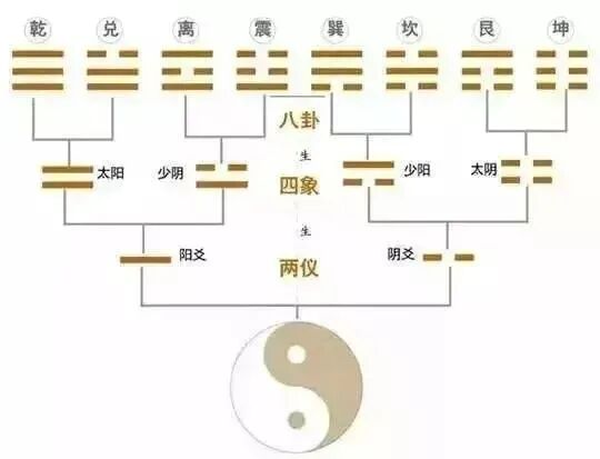 所谓“四象”,就是两组阴阳的组合——上阴下阴,上阳下阳,上阴下阳,上阳下阴。八卦、六十四卦乃至更多卦,都不过是更多数量的阴阳的更多组合可能。