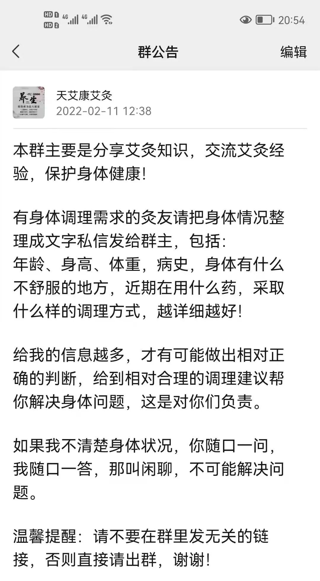所以,很多人咨询时不知道怎么样说清楚身体问题,我就编写了群公告发给他们,让他们尽可能把身体情况说清楚一点,这样可以减少我的询问时间。