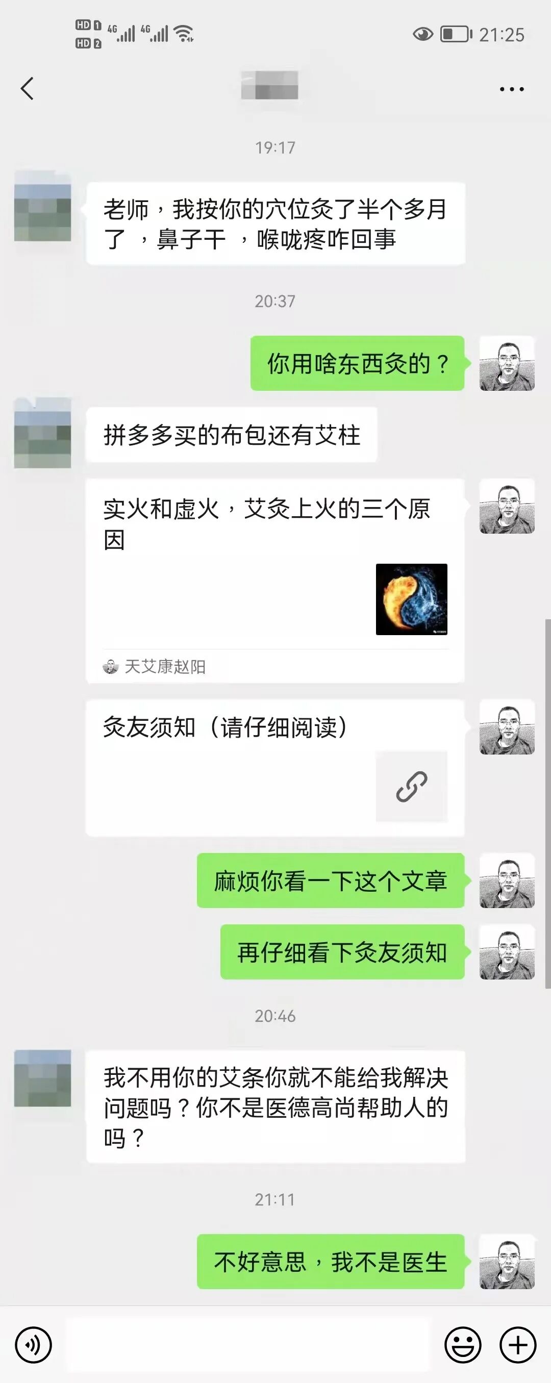 他给我回了一句:我不用你的艾条你就不能给我解决问题了吗?你不是医德高尚帮助人的吗?