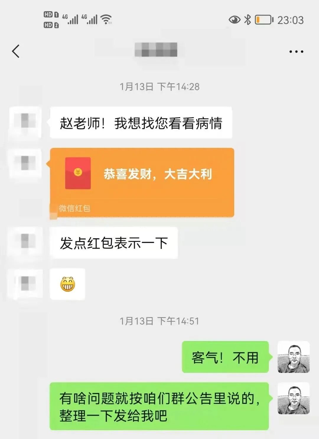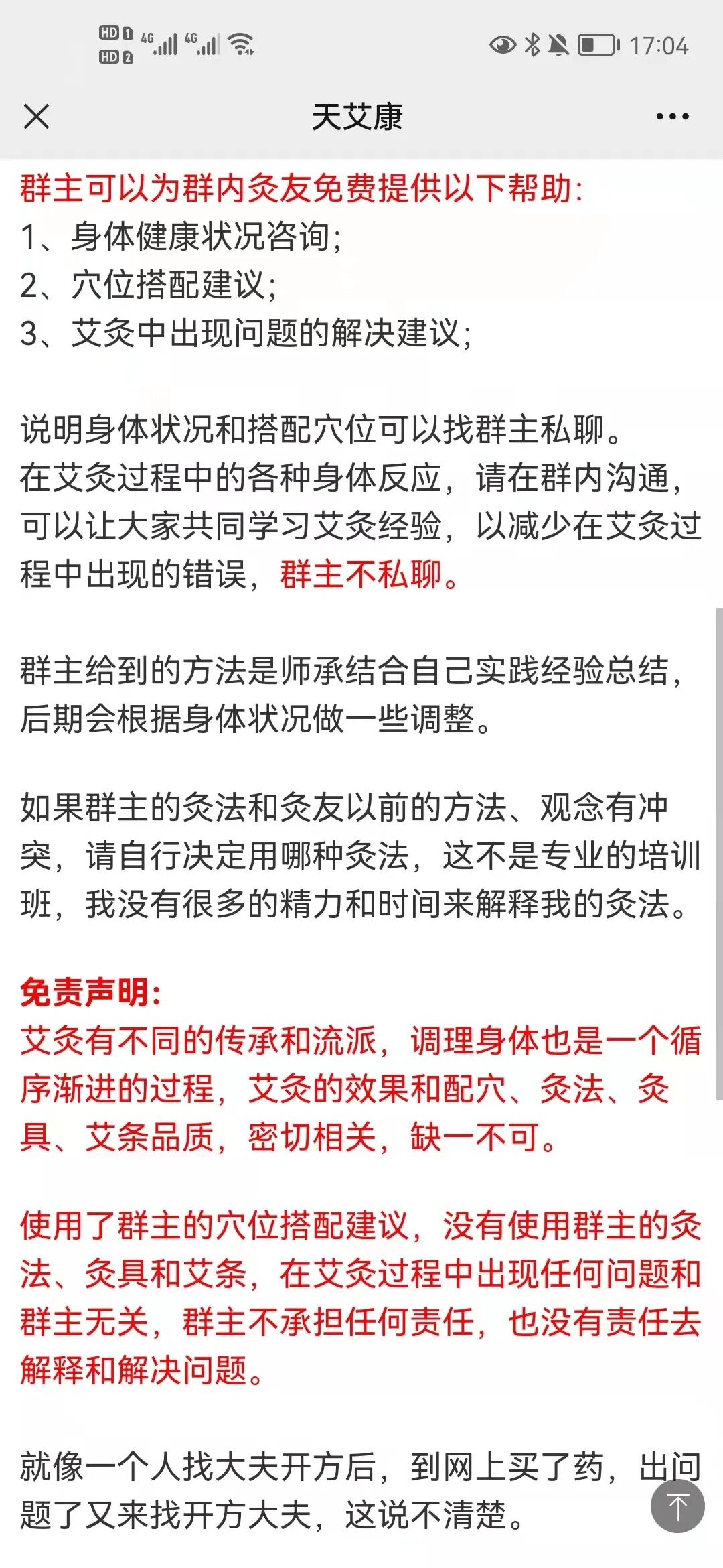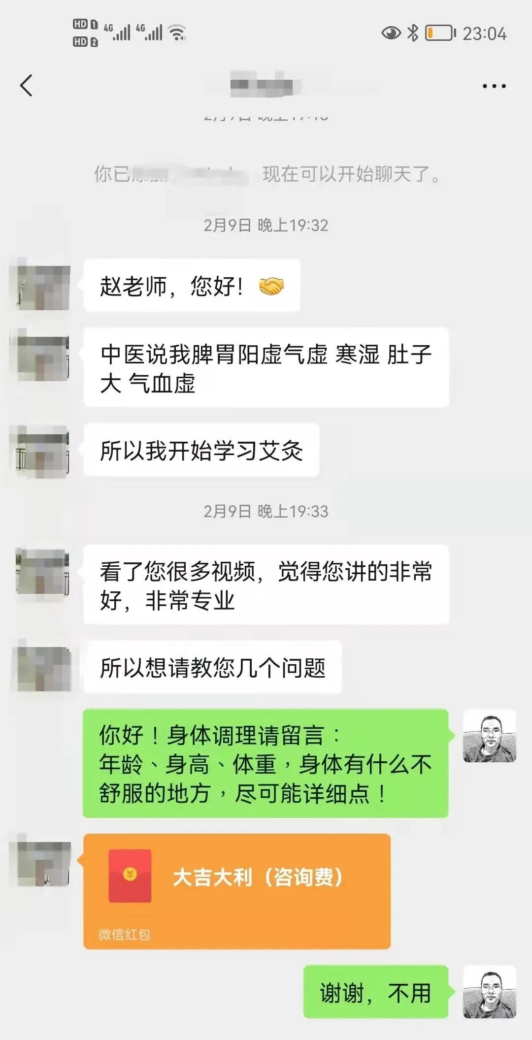 也有一些灸友咨询时给我发红包,我都没收,因为我的”灸友须知“里写的很清楚,不收费。