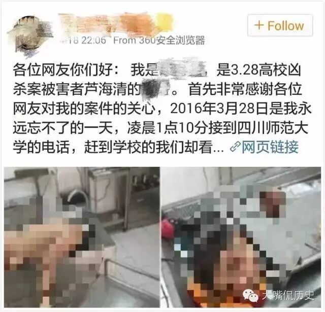 2016年3月28号凌晨1点10分。海清大哥被一阵急促的电话声吵醒,接完电话的老大彻底懵了。弟弟海清所在的四川师范大学打来电话说,弟弟已经没有了生命迹象,当老大赶到事发地(四川师范大学成龙校区宿舍楼东苑2栋一楼自习室)时,他被眼前的场景吓傻了,芦海清身首异处,头颅被砍下,勉强完整的尸体清晰可见的缝合了无数条线,脸上血肉模糊,全身被砍50多刀!