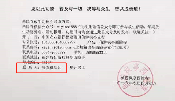 2017年11月29日,福建省莆田市仙游县公安局对外通报,该局破获一起22年前的故意杀人案,案犯是枫亭西隐寺住持释真机。