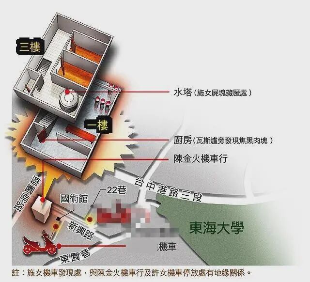 台中地检署表示,2003年12月7日晚,台中县女保险员施金池(27岁)在前往台中县龙井乡陈金火经营的摩托车行后失去行踪,家属向台中县警方报案。警方在2003年12月12日晚上到摩托车行搜索,在三楼水塔内发现装在塑料袋的尸块,经化验证实尸块为被害的女保险员。