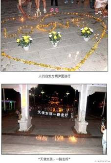 8月1日,在胡伊萱头七的晚上,桦南县民众自发来到桦南西湖广场祭奠了她,洁白的蜡烛围成了数个心形,拉起“天使女孩一路走好”的横幅,放飞了孔明灯。