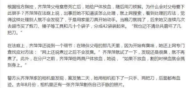 肢解尸体并非容易的事情,齐萍萍在庭上讲述了该过程,检察官提供了相关物证。齐萍萍说,杀害父母之后3个小时,她将父母尸体拖到洗手间,碎尸并不顺利,齐萍萍找来锤子和菜刀,弄了一晚上,只碎了很小一部分,但菜刀却砍钝了。