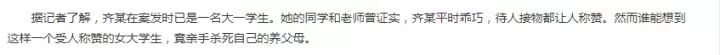 在采访中,齐萍萍表示,养父母对她就像是对自己的亲生女儿,爸爸很善良很善良,也很努力工作,很老实,容易被人骗,妈妈很善良心很软,有时候很凶也是刀子嘴豆腐心,有时候对她严也是真心想为她好。