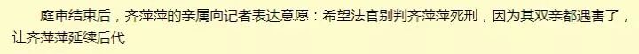 这个齐萍萍无被虐待史,无精神病史,却杀了对她视如亲生的养父母,但是法官认为她的犯罪动机不是很卑劣,没逃跑就是人身威胁性不是极大,虽然年满十八岁可是她的心智发育不够健全,加上受害者家属求情,所以齐萍萍被判处死刑缓期两年执行。