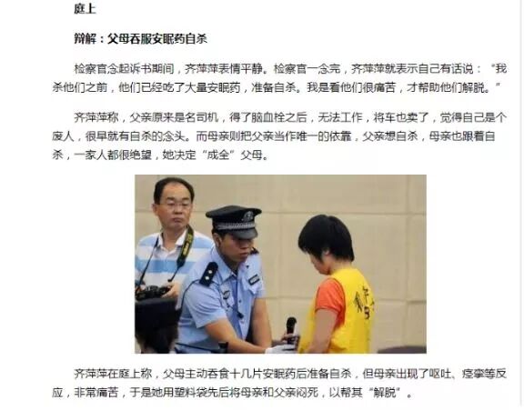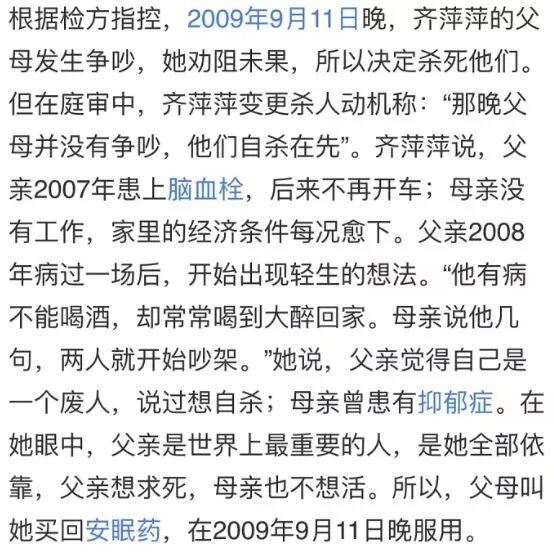 齐萍萍第一次供述说是因为父亲患病,母亲没工作,家庭贫困,父母经常争吵,所以杀死父母是为了成全他们,让他们获得解脱,然后自己打算自杀;