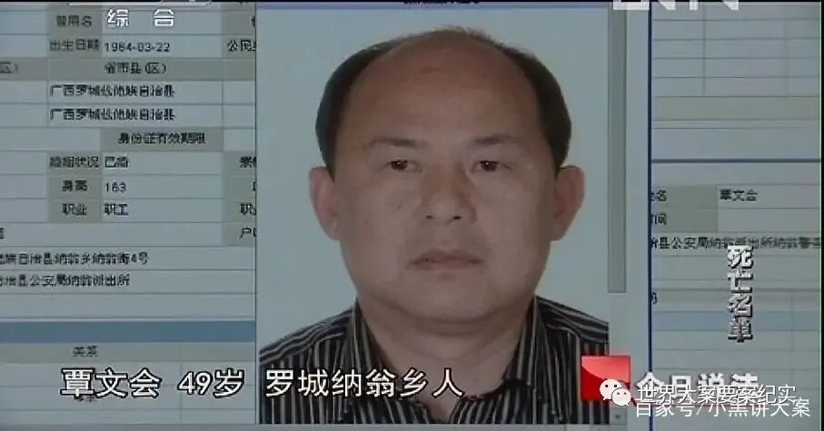 在案发六个小时后,警方终于确定了犯罪嫌疑人!覃文会,49岁,罗城那翁乡人,是个生意人,跟村里很多人都认识。