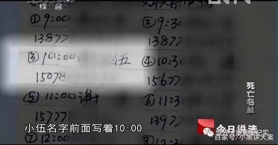 下午16点,碎纸片拼接了出来,是一份名单,上面写着县城客人名单及电话,除了死者小伍、谢军,还有更多人的名字和电话,每个名字前面都写有时间和编号。小伍名字前面写着10点,谢军名字前面写着11点。另外纸上还写着刀、枪、手套、帽子,这很可能是一份杀人计划!
