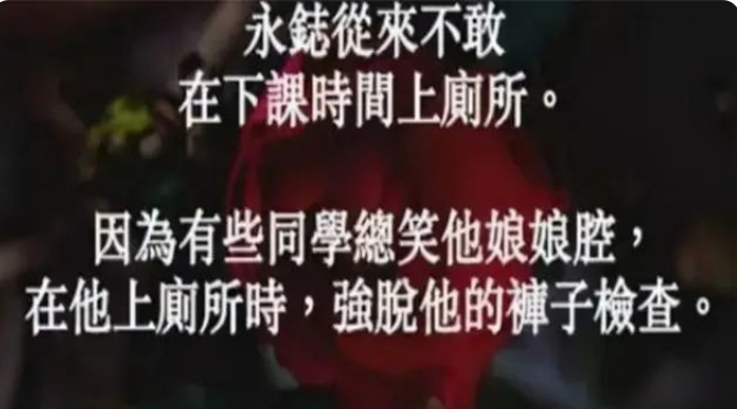 学校里一部分学生出于好奇,想知道他到底是男还是女,就经常在厕所里扒他的裤子,长期以往,无法排解的羞辱感,让叶永志这个少年彻底失去活下去的勇气。