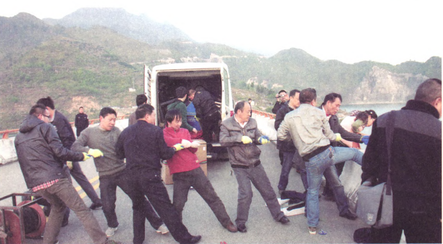 “当地的老百姓都说,这样寒冷的冬天,当地人都习惯于躲在家里‘窝冬’,只有你们才会不要命地在千峡湖上整日忙碌!那一天,好奇的当地人前来观看我们的工作,瞄了一眼就吓坏了。你想,那么大的寒风,那么高的浪,湖中央的工作船哪有平稳可言?放麻绳的人员只要一用力,船就晃得像要翻掉,人随时都会掉进大湖里。记得最长的一条麻绳有1500米,水里浸泡后吃足了水,加上缀在麻绳上的铁片、浮球,重量超过400公斤,十几个小伙子‘嗨哟嗨哟’拉着它在水里铺设,没过多久就累得瘫倒。但我们的计划是一天内必须放完毕。不得已,我们分几批人轮流上,一批人累得吃不消了,另一批人立即接上;上一批人已经喘过一口气了,马上去替换这一批人。那一天的辛苦真的没法用语言来描述,累得所有人员骨头散架,力气耗尽,瘫在地上只会喘粗气,才终于搞定!”