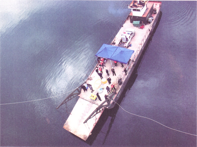 茫茫大湖边,出现了一条外形特别、经常停在某个区域久久不动的船,这便是本次打捞的工作驳船。为加快速度,节省费用,专案组从当地借来这条钢质驳艇,又从杭州西湖文化广场特地借来两顶大帐篷搭在船上,因陋就简地搭起一个临时指挥台。这可是打捞战役的指挥中心!