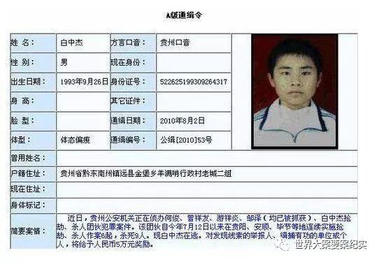 白中杰也是目前公安部A级通缉令中最小的一个罪犯。