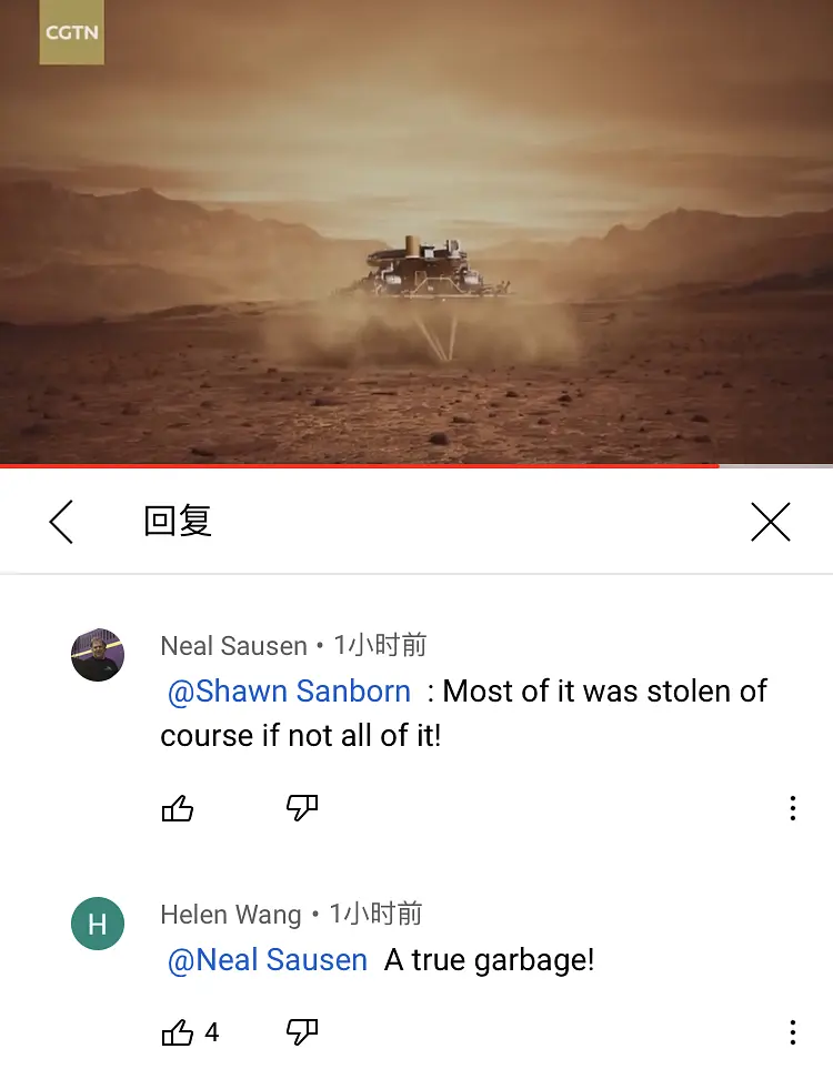 此前,很多网友都关心祝融号何时能传回火星的照片和视频。有外国网友称,美国毅力号火星车登陆后很快就传回影像,而祝融号为什么隔这么久还没有“动静”?甚至有外国网友在中国国际电视台(CGTN)转发的登陆动画后面跟帖中进行嘲讽。