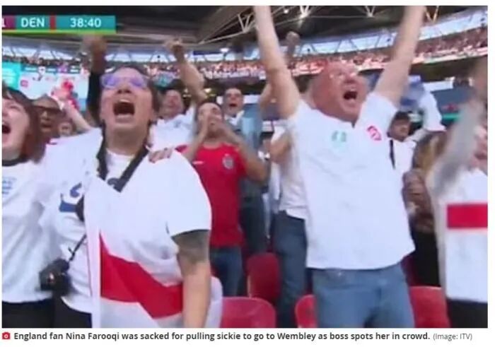 据中新网10日报道,日前,37岁的英国女子法鲁奇请病假前往温布利球场看欧洲杯半决赛,没想到一个直播机位刚好捕捉到她在现场的画面,又恰好被电视机前的老板看到,她随即遭到开除。