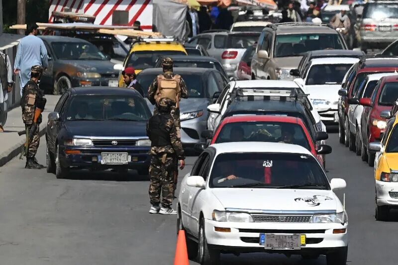 9月4日,塔利班人员在阿富汗喀布尔检查往返车辆。新华社/法新