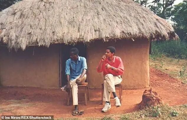 1987年,奥巴马(右)在肯尼亚老宅前抽烟。