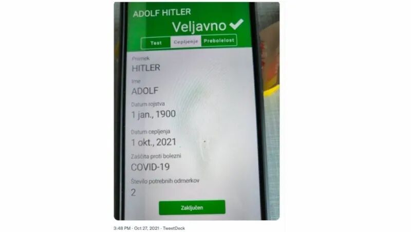 一张名为阿道夫·希特勒(Adolf Hitler)的欧盟数字新冠“绿色通行证”本周在网上流传,该绿码竟然可以通过意大利官方的验证系统。虽然它之后被宣布无效,但引发了人们对“疫苗护照”系统安全性的质疑。