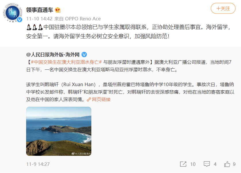 11月10日,外交部领事保护中心官方微博@领事直通车 表示,中国驻墨尔本总领馆已与学生家属取得联系,正在协助处理善后事宜。