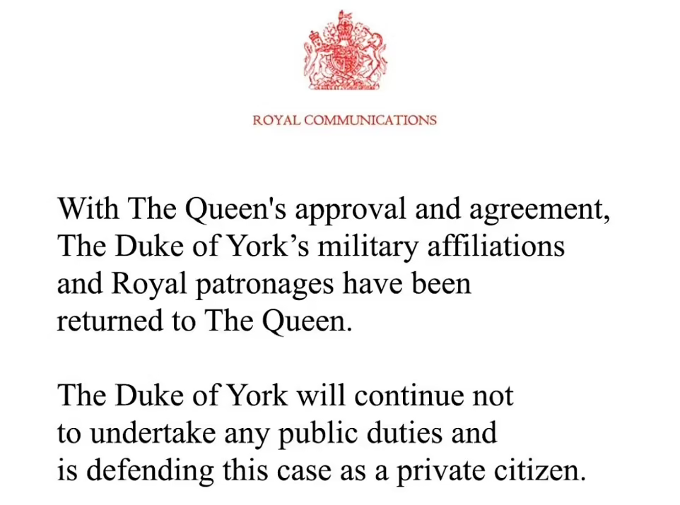 英王室发布女王剥夺安德鲁王子王室头衔和赞助的声明。