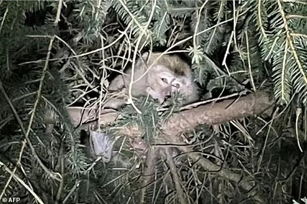 警方发布的照片显示,一只猴子夜晚藏在公路旁的一棵树上