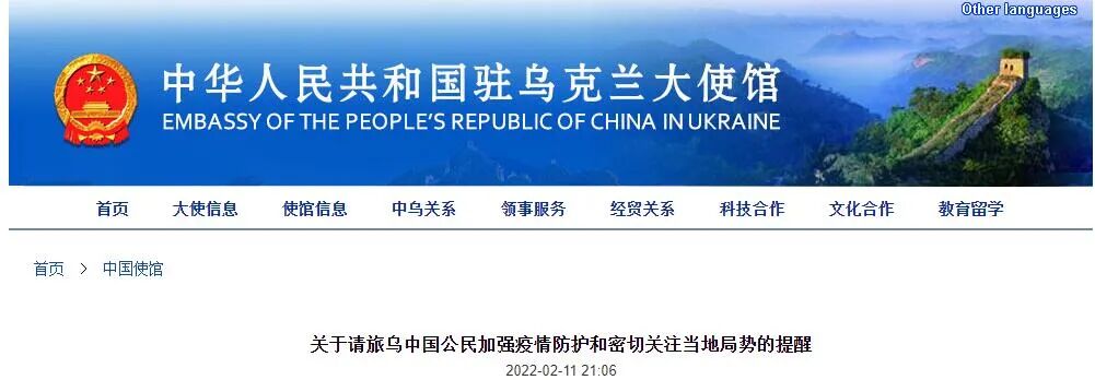 2月11日晚,中国驻乌克兰大使馆发布《关于请旅乌中国公民加强疫情防护和密切关注当地局势的提醒》。