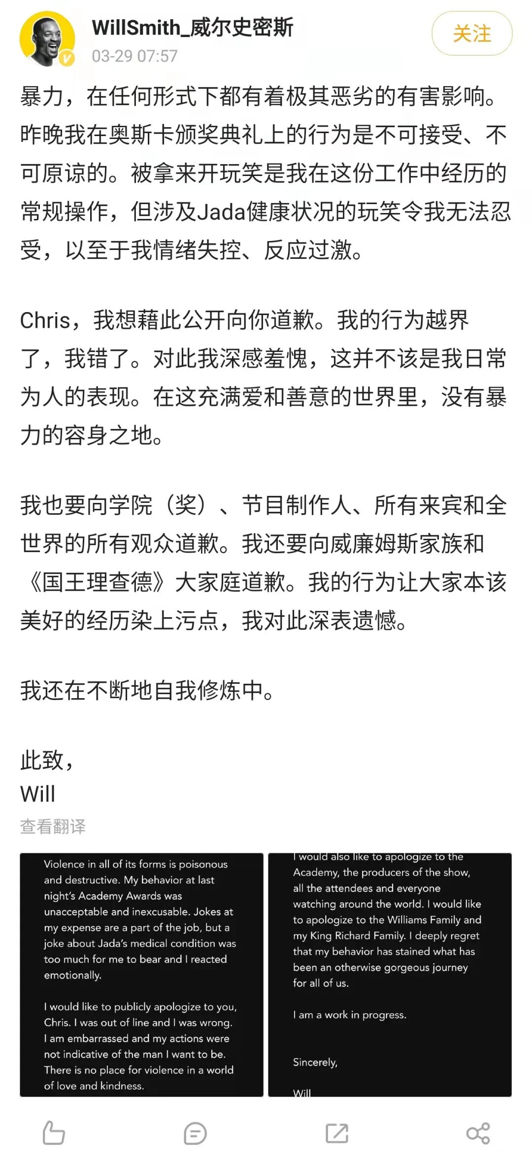 北京时间3月29日上午,威尔·史密斯在其社交平台上发文致歉。