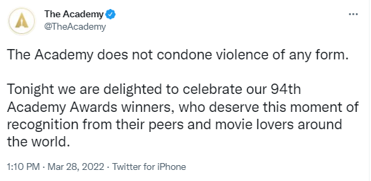 据南都此前报道,当地时间3月28日凌晨,奥斯卡官方推特账号发布推文表示,“(奥斯卡)学院不容忍任何形式的暴力”。
