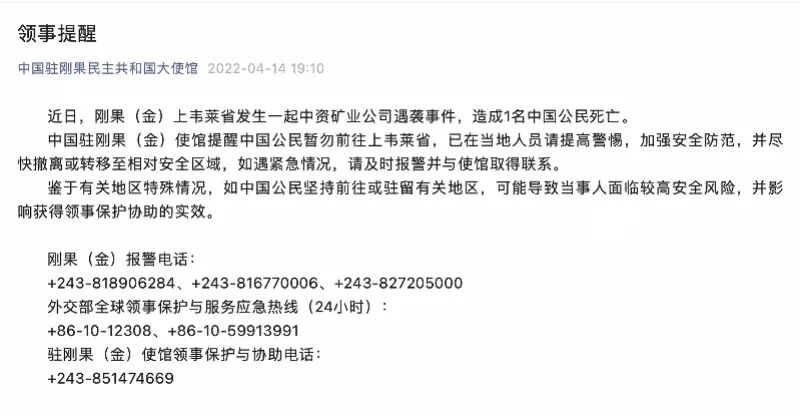 4月14日晚,中国驻刚果民主共和国大使馆发布领事提醒称,近日,刚果(金)上韦莱省发生一起中资矿业公司遇袭事件,造成1名中国公民死亡。该使馆提醒中国公民暂勿前往上韦莱省,已在当地人员请提高警惕,加强安全防范,并尽快撤离或转移至相对安全区域,如遇紧急情况,请及时报警并与使馆取得联系。南都记者注意到,该使馆近期已多次就当地局势发布相关安全提醒。