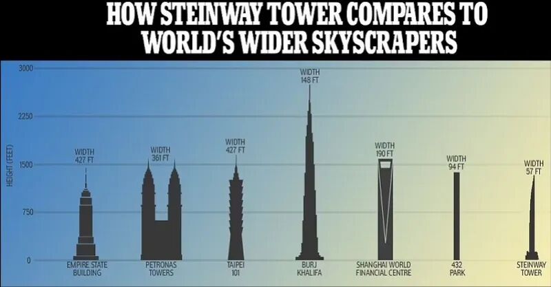 然而,施坦威大厦只有57英尺(17米)宽,高宽比达到了24:1。与世界其他摩天大楼相比,该建筑物确实过于“瘦削”,比如,全球最高建筑迪拜哈利法塔宽148英尺(45米),上海环球金融中心宽190英尺(58米),纽约帝国大厦宽427英尺(130米)。