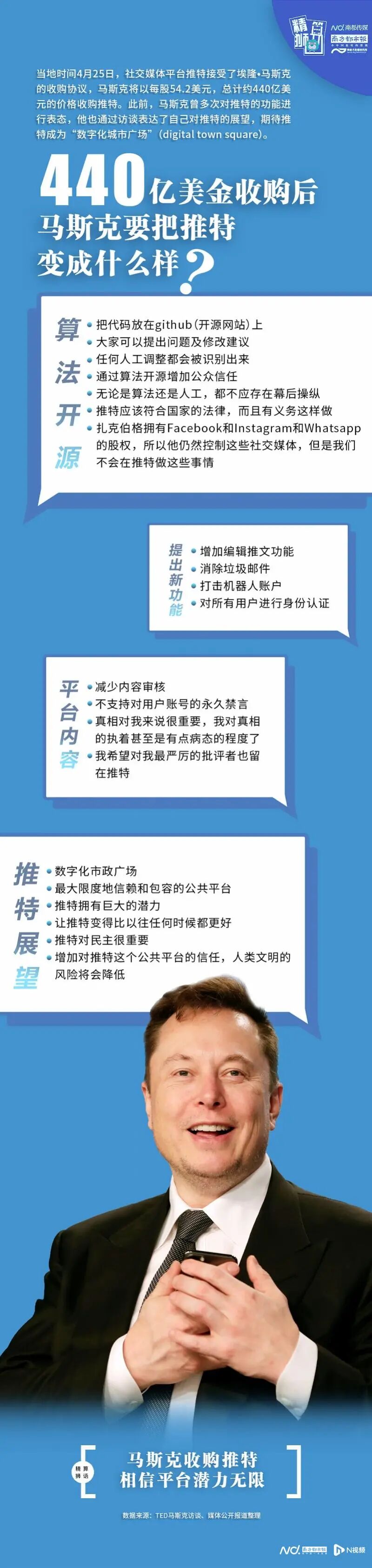当地时间4月25日,美国社交媒体平台推特接受了埃隆•马斯克的收购协议,马斯克将以每股54.2美元,总计约440亿美元的价格收购推特。推特公司亦接受了将推特私有化的提议,交易完成之后,推特将不再作为纽交所上市公司,完成退市。