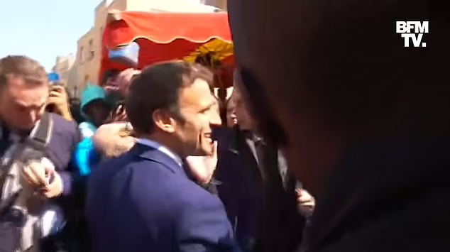 27日,马克龙会见当地居民时,忽然一群樱桃大小的西红柿呼啸而过,虽然靠近他的脸,但没有击中他,击中了旁边的人。