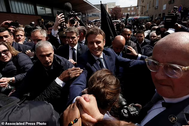 法国现任总统埃马纽埃尔·马克龙赢得大选连任后在4月27日首次公开露面,然而却成为一名心怀不满的选民投掷西红柿的目标。随身保镖迅速打开雨伞保护他离开。还有一名陌生男子试图攻击未果。观察人士警告,这表明法国民意被撕裂的程度之严重。