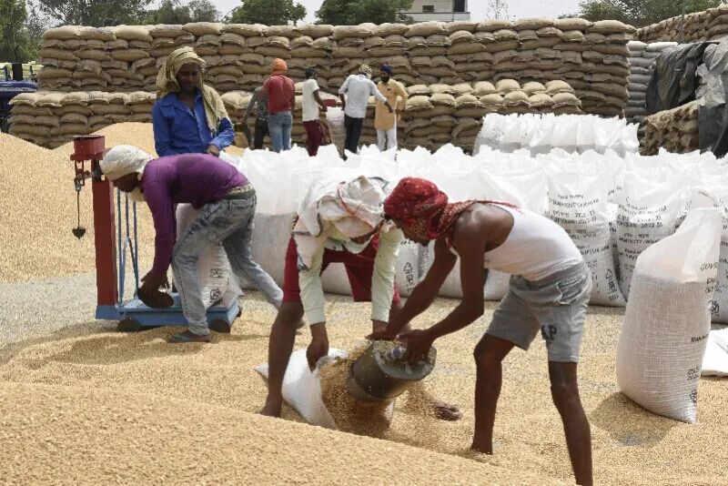 4月16日,人们在印度阿姆利则郊外的一家批发市场分包装小麦。新华社/法新2022年5月14日发