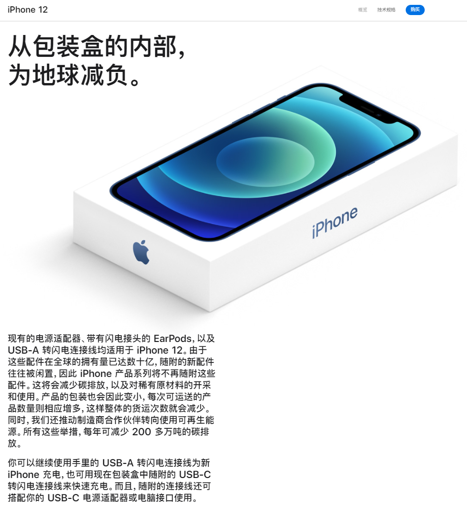 去年10月,苹果公司称因为大多数客户已有备用的充电器,出于环保考虑,iPhone 12的包装盒内将不再附赠充电器,仅配送一条数据线。