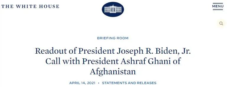 当地时间14日,美国白宫新闻简报官网发布消息称,当天美国总统拜登与阿富汗总统加尼通电话,双方就美军、北约军队从阿富汗撤军进行了讨论。