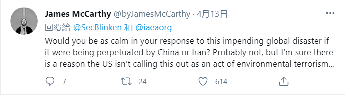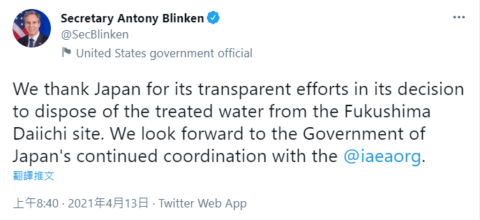 同一天,美国国务卿布林肯在推特上表示,“感谢日本在核污水问题上为‘透明’所做的努力”。