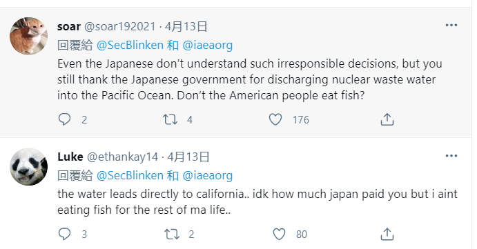 在布林肯“感谢”日本的推特下,有许多高赞评论质疑日本排放核污水将影响美国的海岸。有网友指出,在日本渔民仍然在抗议日本政府排放核污水的情况下,美国政府却要“感谢”日本,这让美国西海岸的民众不敢吃鱼了。