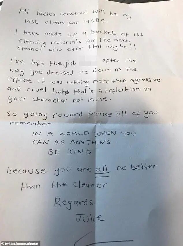 朱莉的离职信是一张便条,上面写着:“女士们好,明天将是我最后一次为汇丰银行打扫卫生。我已经为下一位清洁工准备了一桶清洁材料,不管他是谁。由于你在办公室里对我的态度,我已经离开了(经理的名字)的工作。这不过是咄咄逼人和残忍的行为,但这是你性格的反映,而不是我的。所以往后,请你们所有人记住:在这个世界上,当你可以成为任何大人物之时,一定要友善,因为你们并不比清洁工更好。”